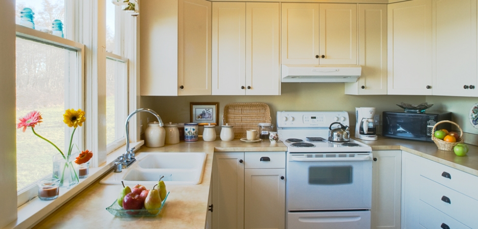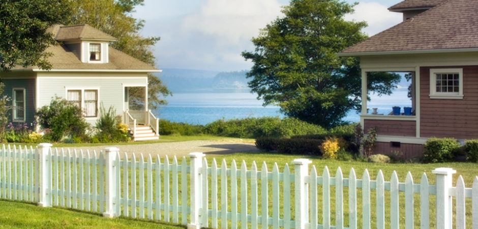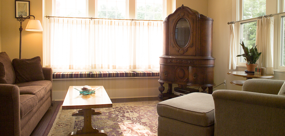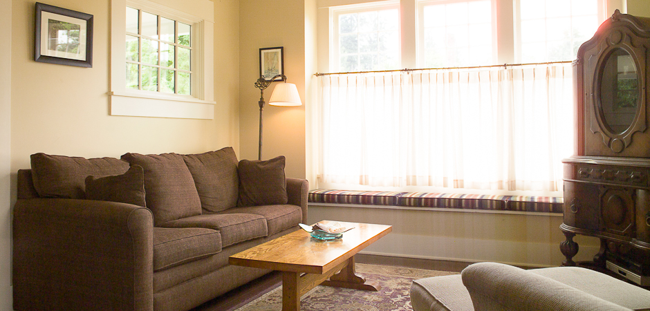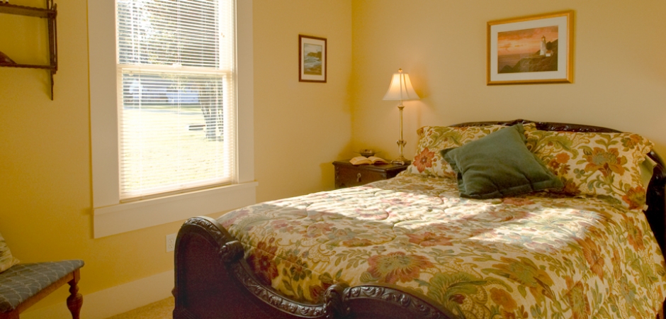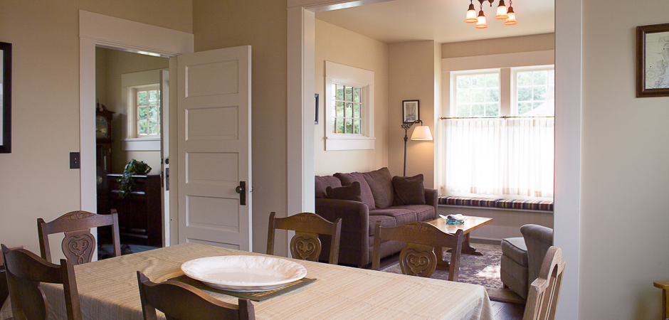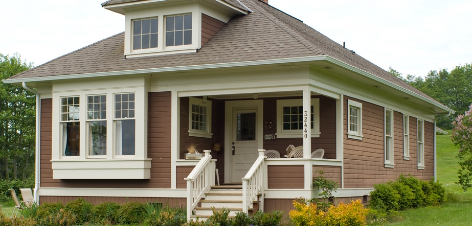 This idyllic and beautifully decorated vacation rental cottage (the brown house) features a three bedrooms, two baths, and can sleep up to eight people.  It includes a fully equipped kitchen, dining room, fireplace and living room.  All common areas provide beautiful views of the water.